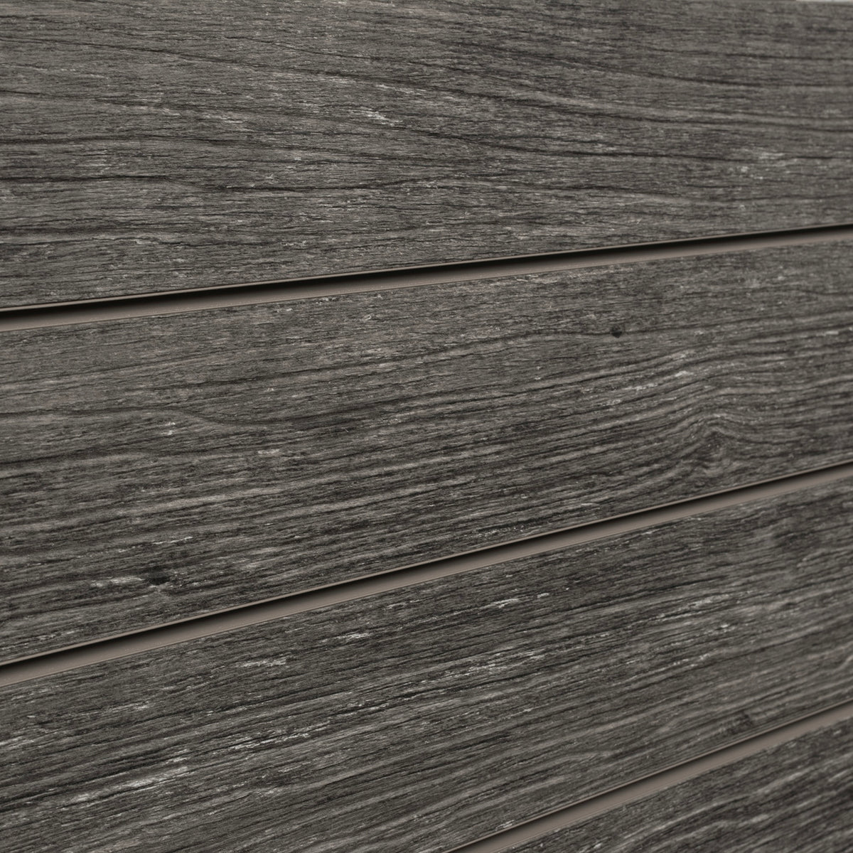 These 3D Slatwall panels are textured and printed to look like real weathered wood. Panels are 2' x 8' so they can be cut to stagger seams, which allows for a more seamless install. Panels come with painted-to-match strips which cover the aluminum slat tracks.