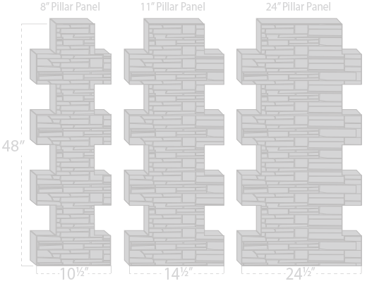 Pillar Panels come in 3 widths, 8”, 11”, and 24” (inside dimensions) and are all 48” high. The Pillar Panels are finished off perfectly with Ledge Trims, or if your pillar is taller you can stack them on top of each other.